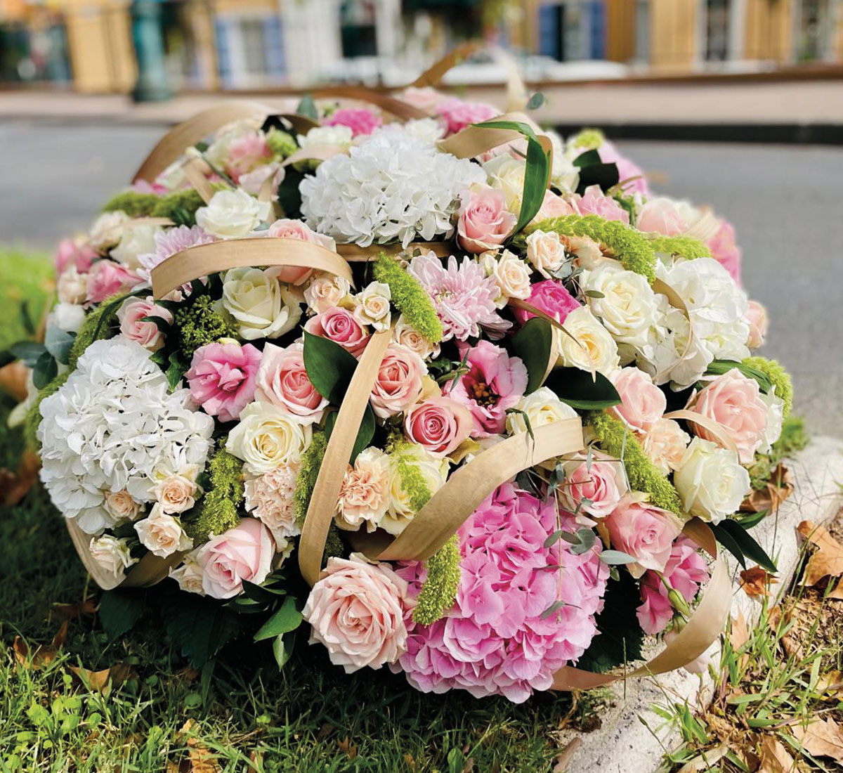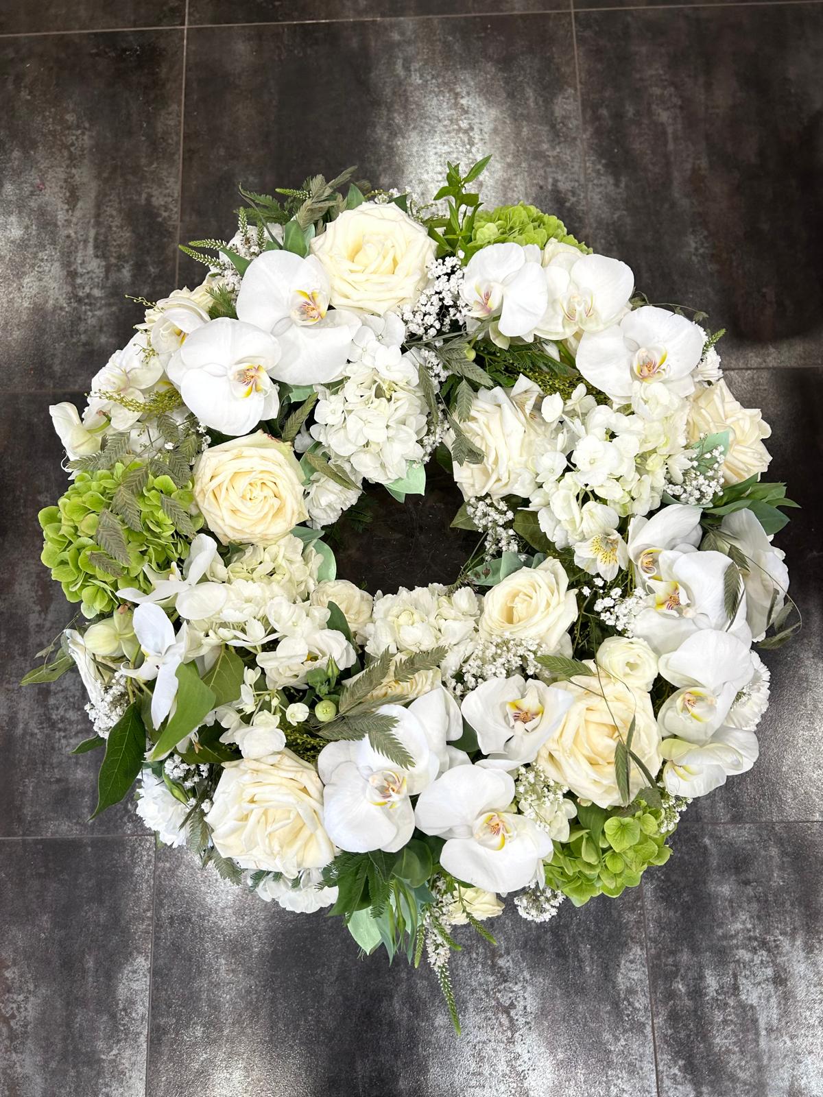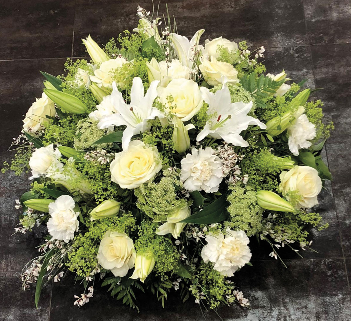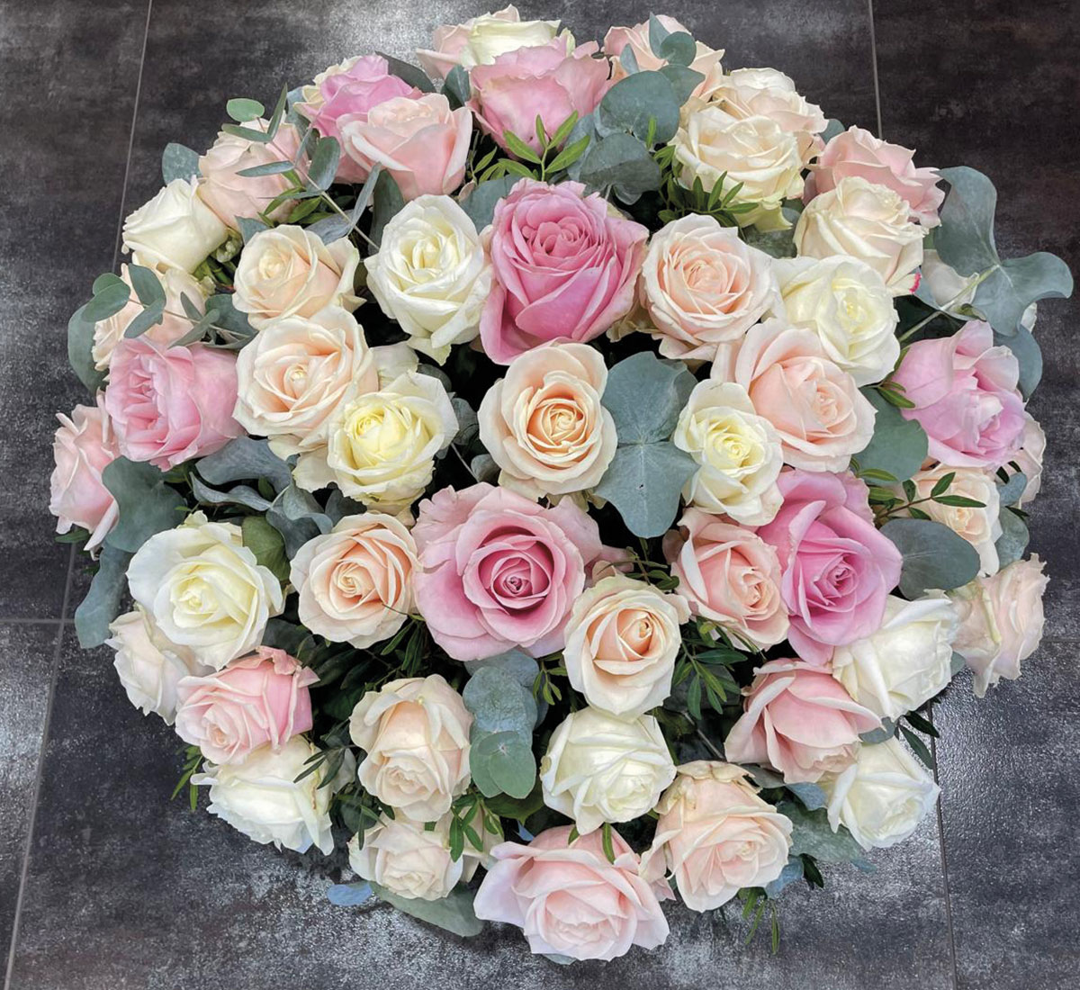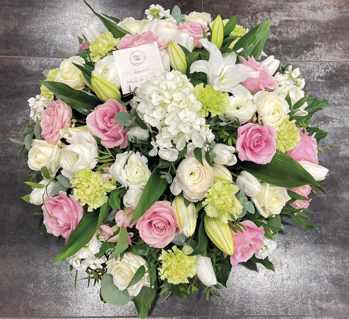 Nous vous proposons des pièces florales adaptées à ce moment particulier : cœurs, coussins, raquettes, couronnes, grandes pièces… 🕊